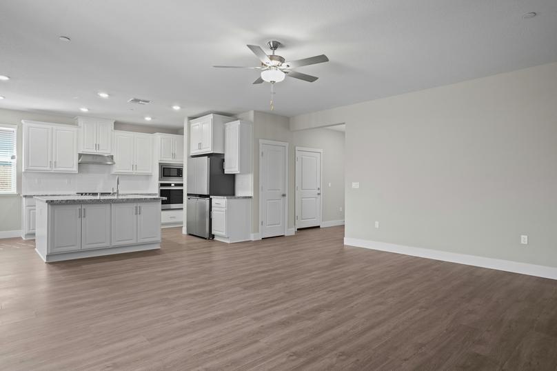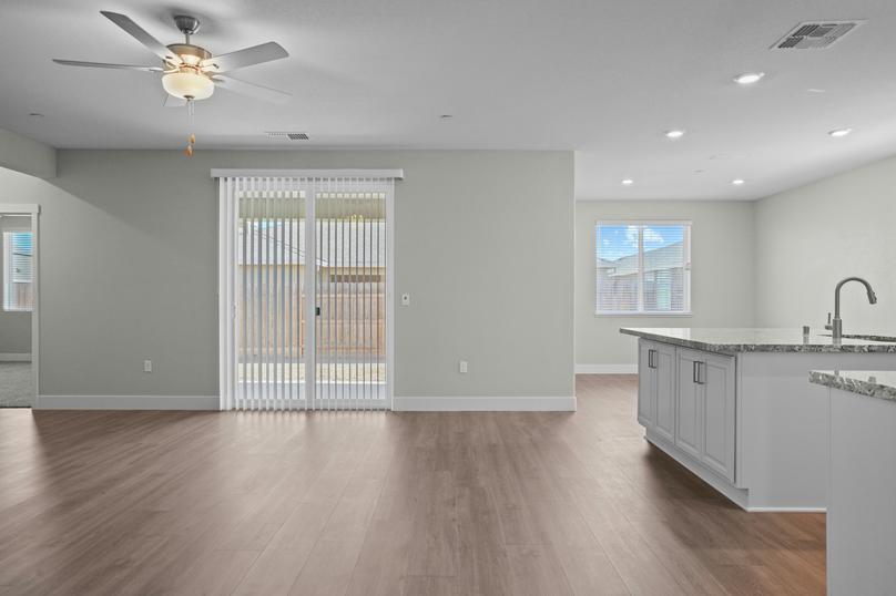 Enjoy a large family room that opens to a remarkable covered patio in the Sullivan plan. Invite your friends and family over and move dinner outside, or relax and sip your morning tea in the shaded space. This covered back patio is perfect for relaxing and entertaining.