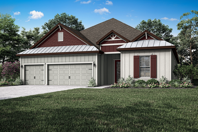Welcome to the Palm Beach, a four-bedroom, single-story retreat that masterfully blends luxury, functionality, and architectural sophistication. Located in Bryceville at Stables at Cary Forest, this exceptional home offers an elevated living experience defined by open spaces, premium finishes, and thoughtful details throughout. From the moment you enter through the covered front porch, you'll be drawn into a spacious open-concept layout that seamlessly connects the main living areas. The chef-inspired kitchen serves as the centerpiece, equipped with stainless steel appliances, quartz countertops, and 42-inch upper cabinets with crown molding. Adjacent to the kitchen, the oversized family room and dining area open directly to a covered outdoor living space, creating the ideal setting for gathering with friends or relaxing in the Florida breeze.