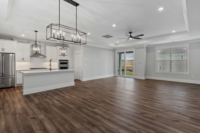 This living room is characterized by its expansive layout and high ceilings, creating a sense of openness and airiness. The space features large windows along the walls ensuring abundant natural light. The open layout connects the room to adjacent spaces, enhancing the flow and making it an ideal setting for gatherings. Lastly, the designer luxury vinyl plank flooring, adds to the room’s elegant yet functional design.