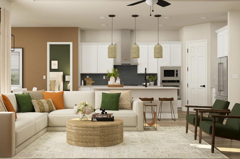 An incredibly designed home for the modern family, the Iris floor plan is brimming with curb appeal and upgraded interior finishes. Passing under the covered front porch and through the welcoming foyer, you will find yourself in the open-concept kitchen. The kitchen opens to the family room and dining area, allowing you to effortlessly move from space to space. Off the dining area and through the back door, you have access to an impressive covered outdoor living space . The single-story Iris also includes a flex room off the foyer providing the whole family with spaces for both work and play.