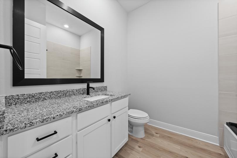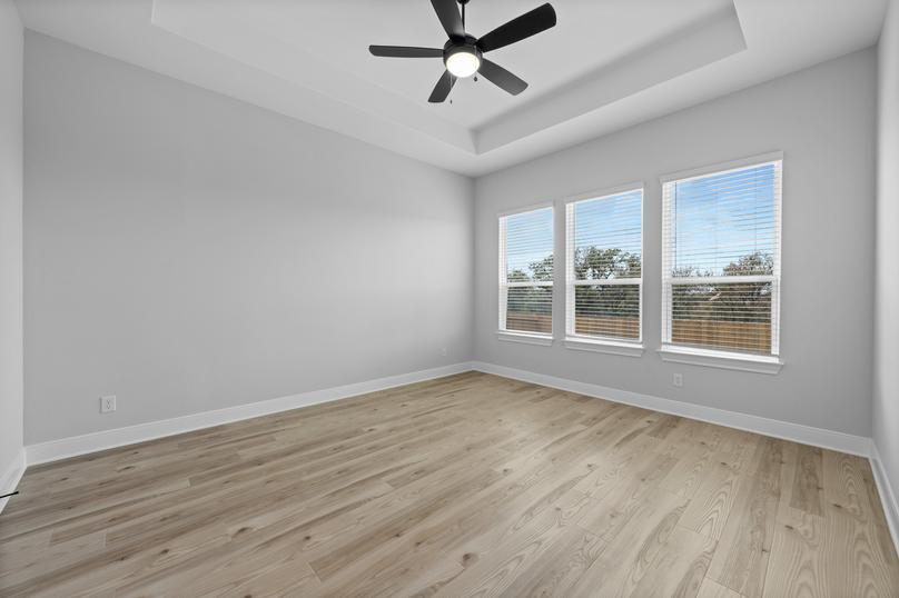The master retreat of the Belzer plan is the perfect space to begin and end each day. Tucked away from the additional bedrooms, the master suite boasts a beautiful high ceiling and plenty of natural light. The en-suite master bath showcases a gorgeous dual-sink vanity, a separate shower, a stunning soaker tub and access to the spacious walk-in closet.